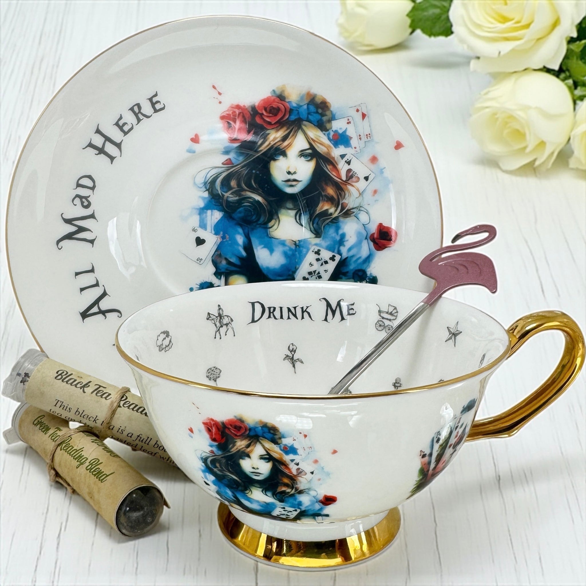 "Drink Me" and journey down the rabbit hole. Pair with Karin’s exclusive tea leaf reading blends, available in green or black tea.