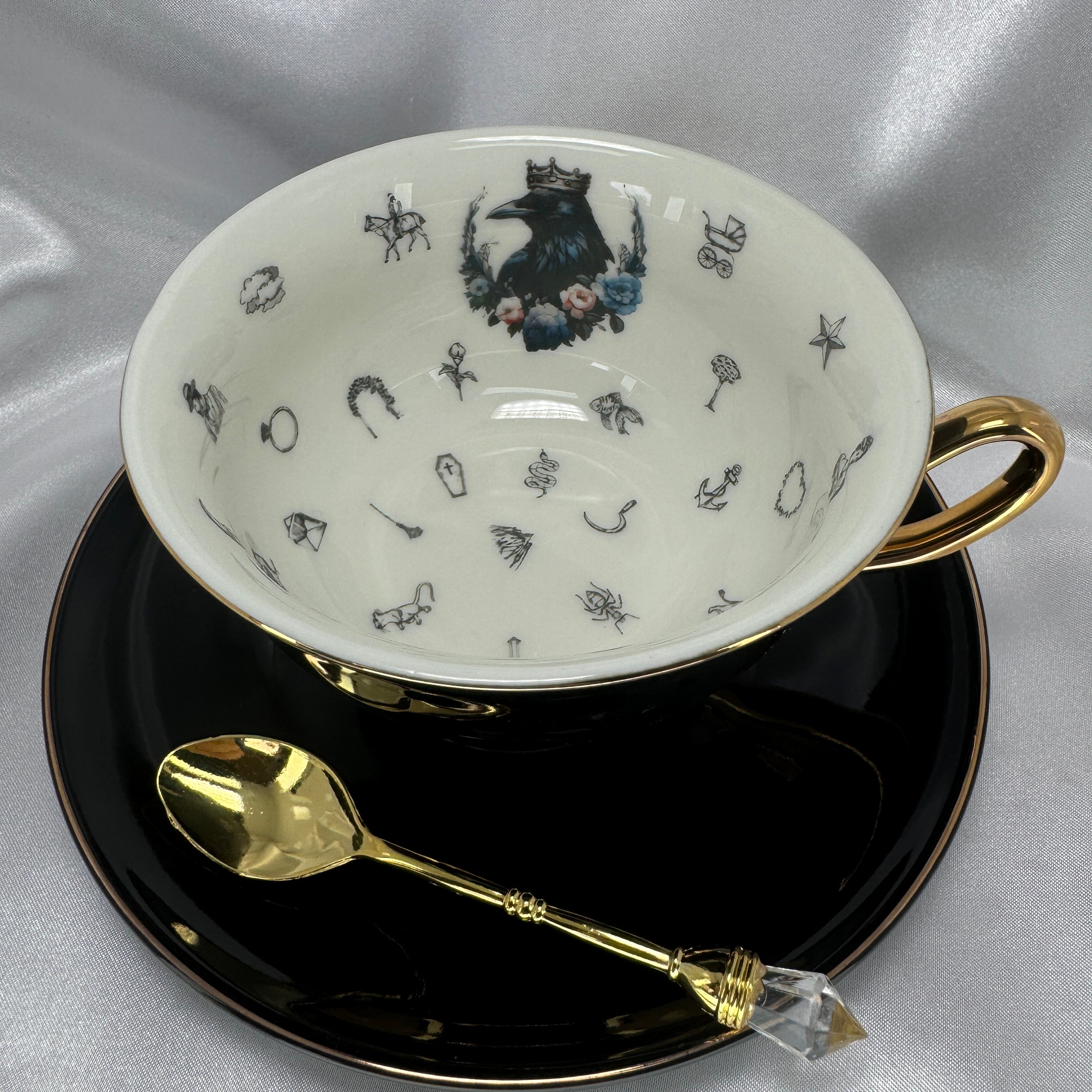 This is a limited edition, striking jet black tea leaf reading kit designed for the modern mystic and collector. The 220 ml porcelain teacup features a Crow wearing a golden crown with 32 classic divination symbols inside and is finished with real 24K gold accents.