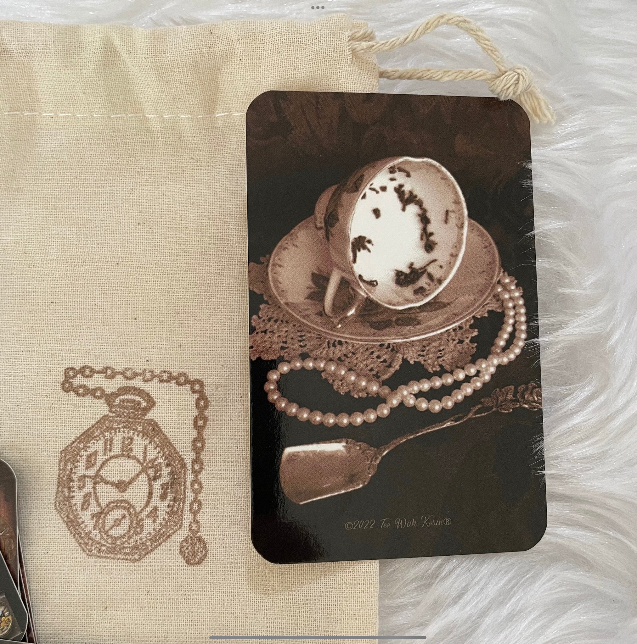 “There is Always Time for Tea” features rich, warm brown tones with hidden clock designs subtly incorporated into the background. These tea leaf reading cards are perfect for forecasting your future and exploring divination through symbolism and intuition.