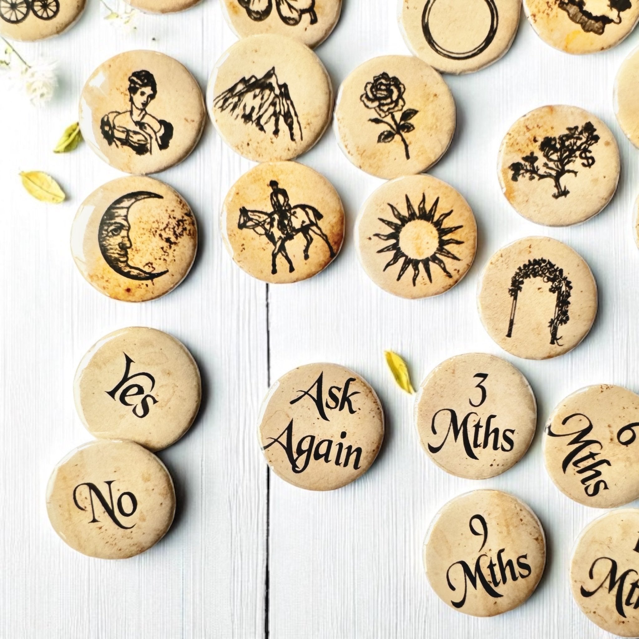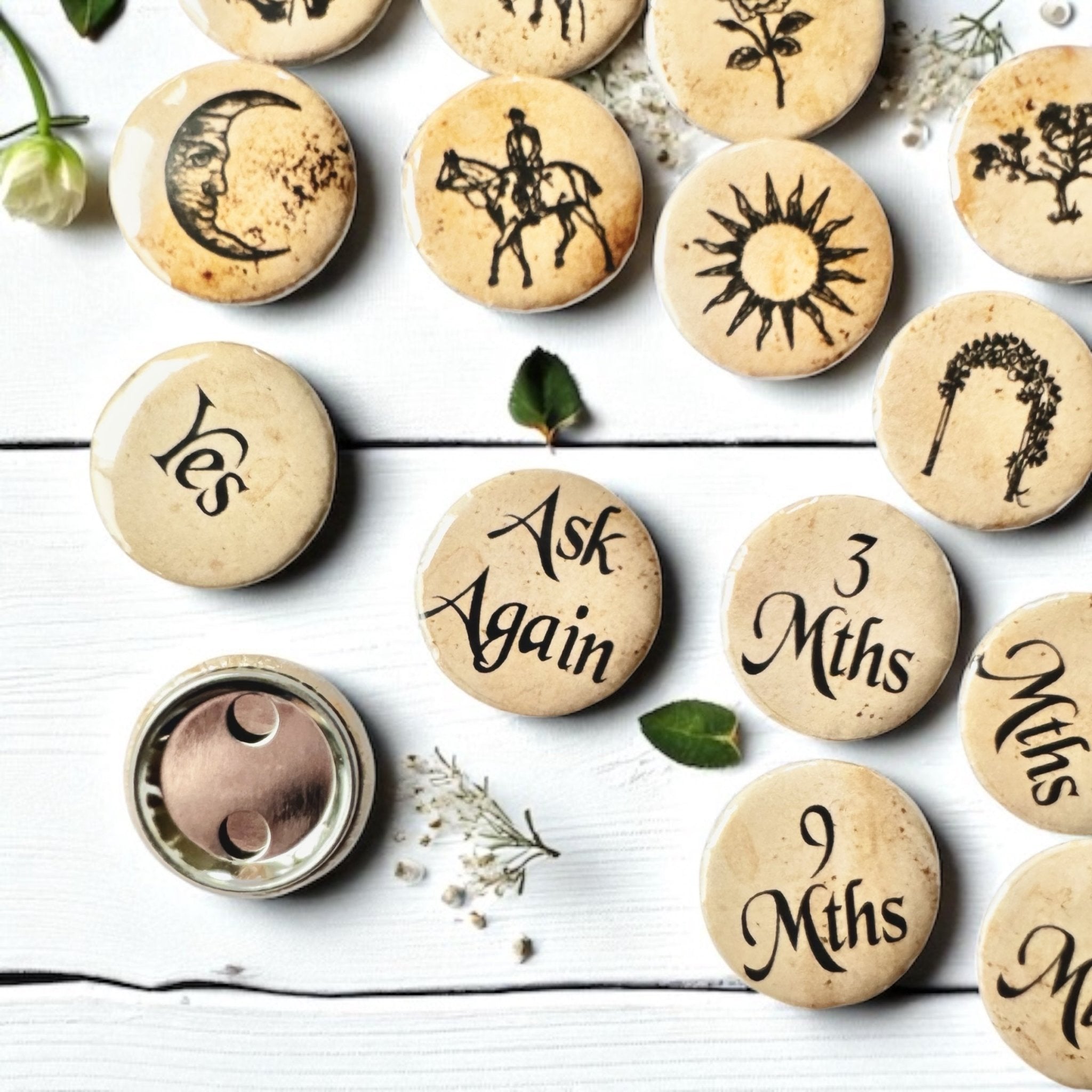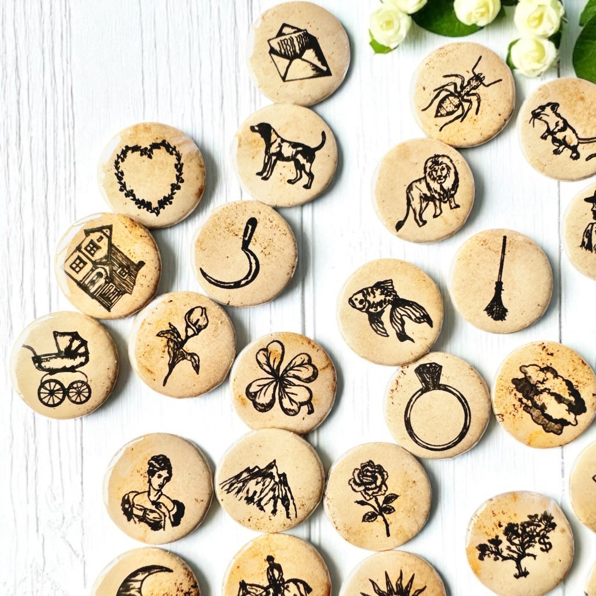 Some of you may recognize these images as the Original Lenormand symbols, which are the same symbols found in many of my fortune-telling teacups. These high-quality buttons are perfect for charm casting, divination, or affirmation practices.