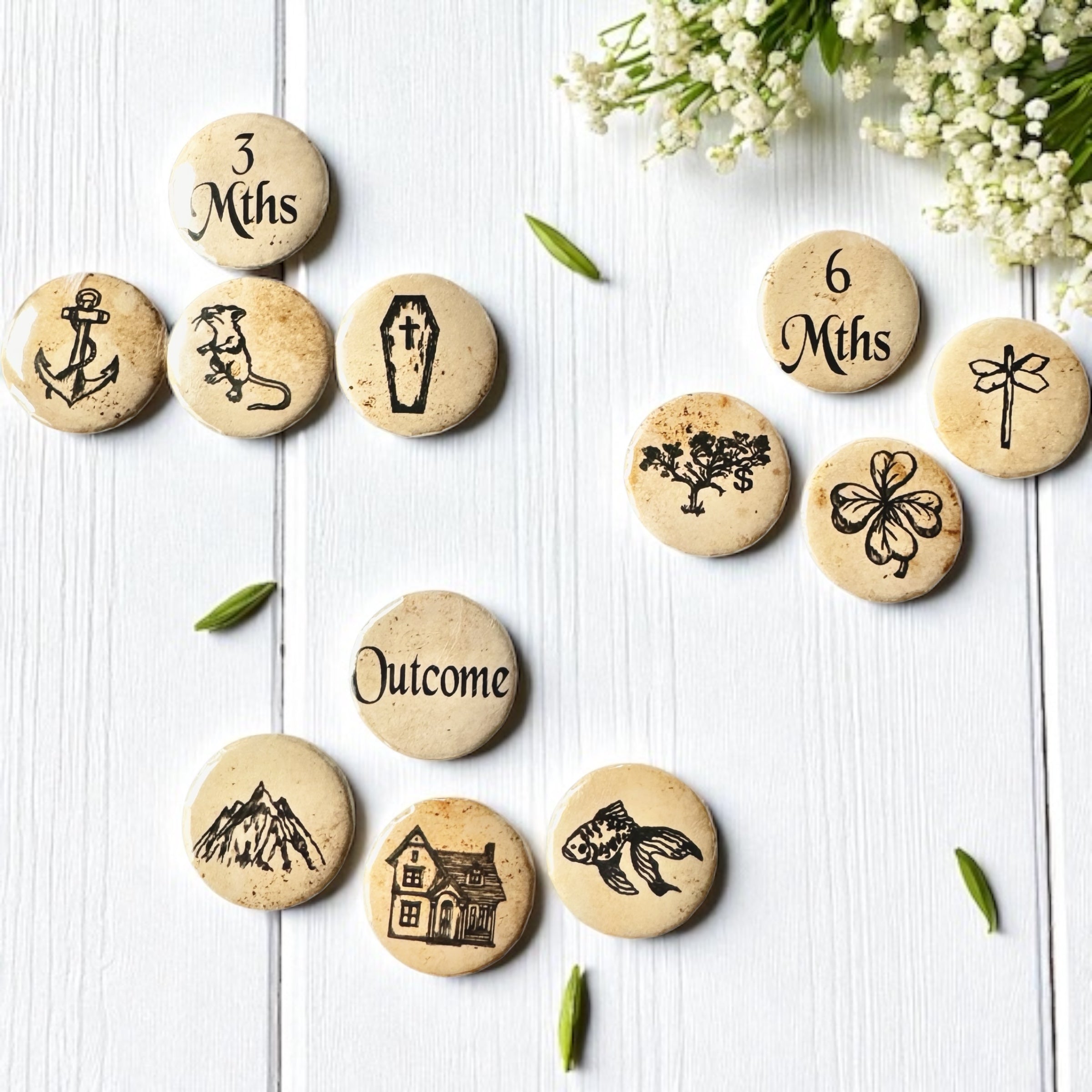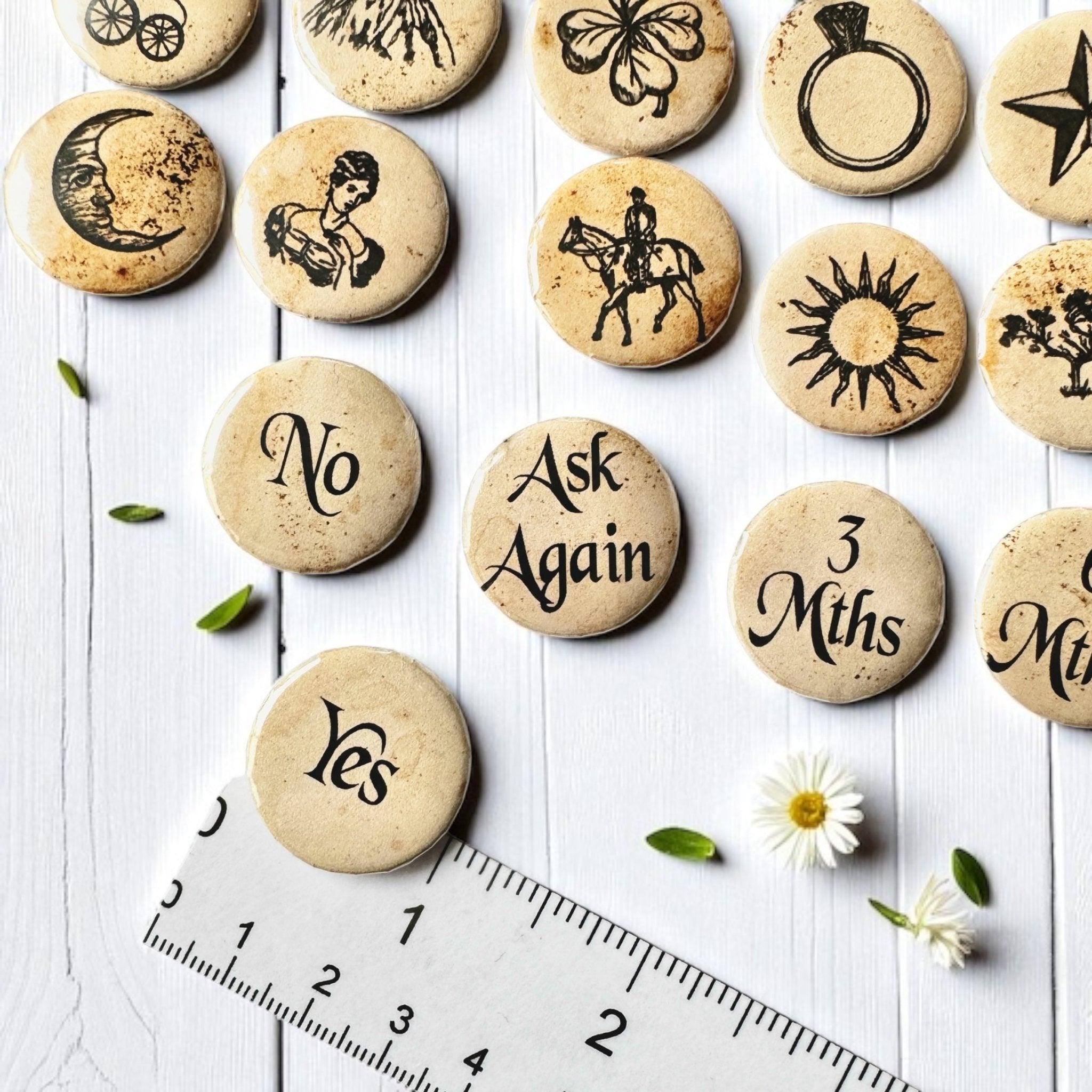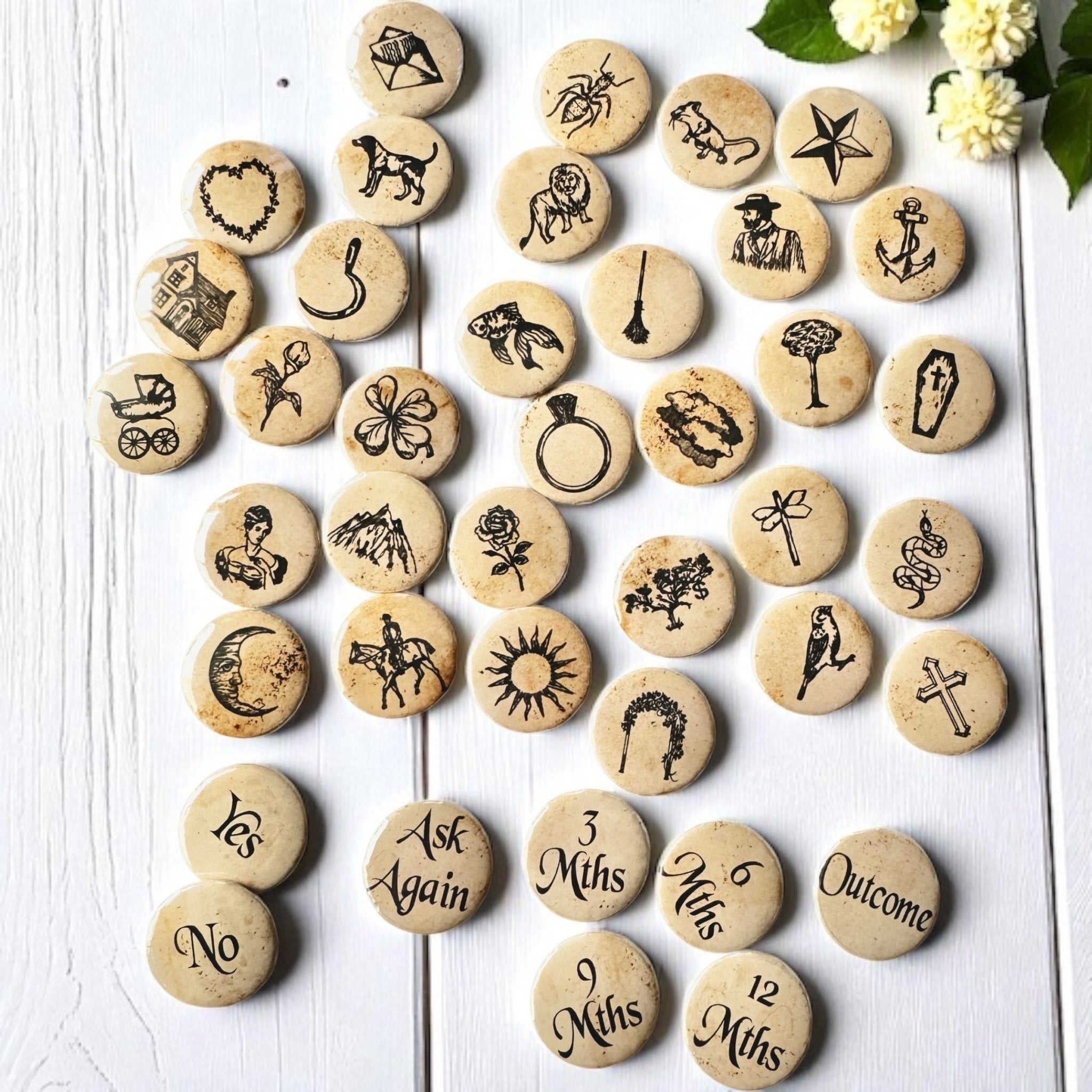 Some of you may recognize these images as the Original Lenormand symbols, which are the same symbols found in many of my fortune-telling teacups. These high-quality buttons are perfect for charm casting, divination, or affirmation practices.