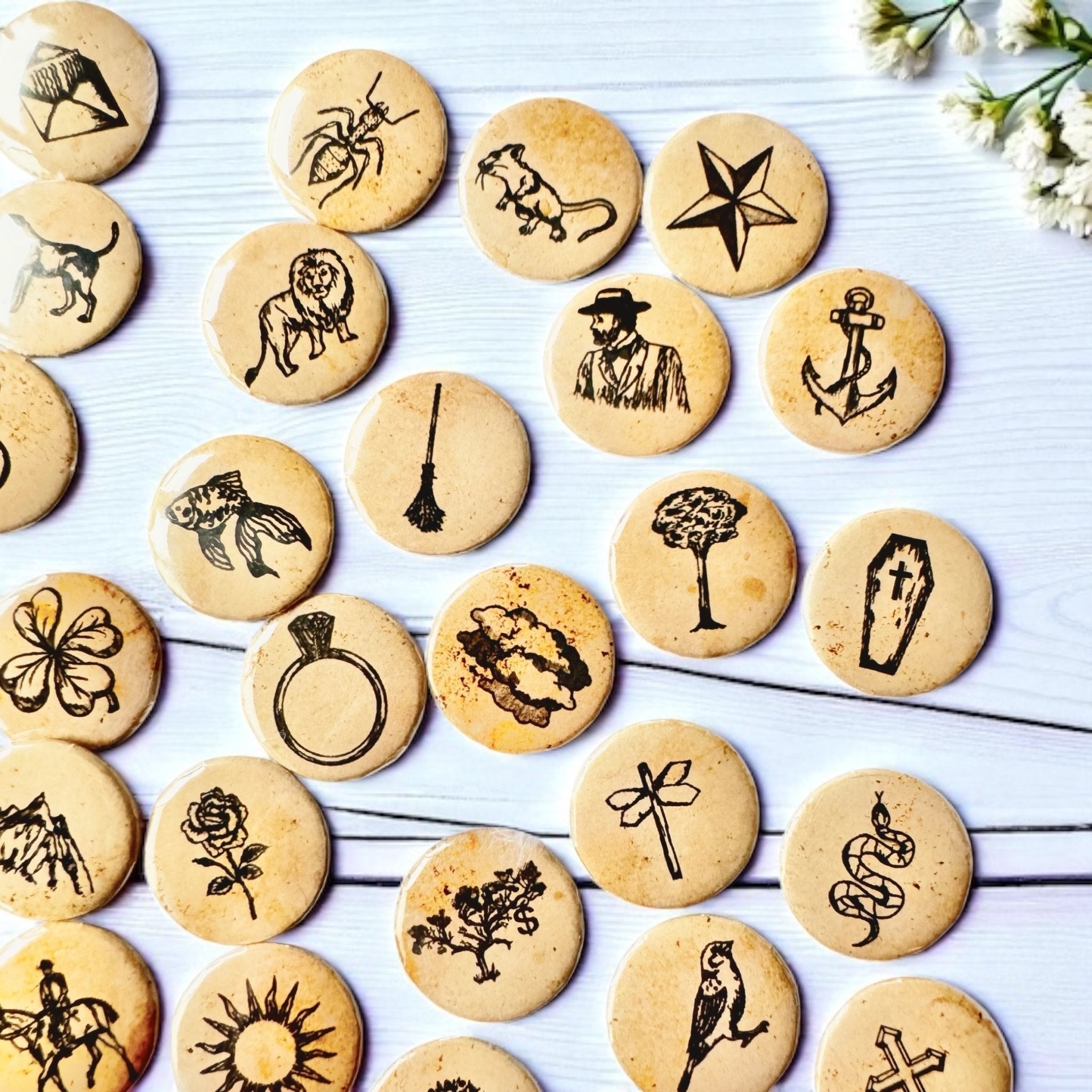 Each button measures 1 inch (25 mm) in diameter and is crafted from pressed aluminum for durability. The images are protected with a clear plastic film, ensuring they remain vibrant and intact through regular use. The buttons feature a soft, vintage tea-stained background, adding a delicate, elegant touch to your spiritual and divination tools.